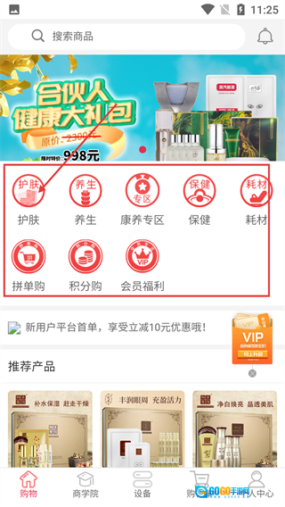 在购物首页点击【护肤】分类入口,即可进入护肤商品页面,该页面除展示护肤产品外,还设有【养生】【拼单购】等功能选项及相关推荐产品。