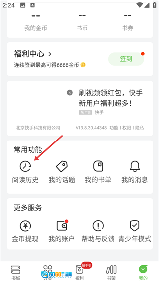 点击【常用功能】板块中的【阅读历史】选项,即可查看之前浏览过的阅读内容。