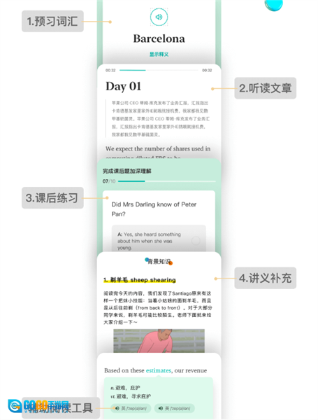 软件词汇预习、阅读/听读、课后练习及讲义四大模块,助力你循序渐进、全方位提升。学习过程中还配备查词、难点标注等实用辅助功能,让你轻松攻克每一个知识盲点。