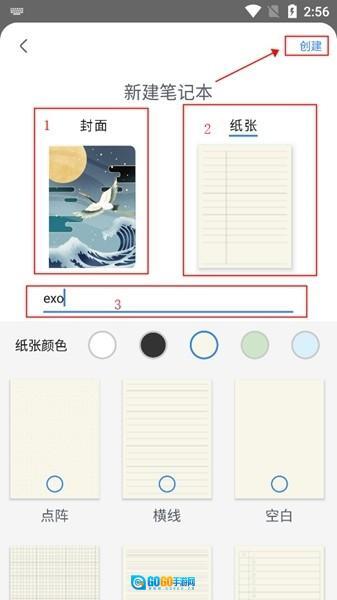 进行到第三步时,你需要先挑选笔记本的封面样式,接着确定纸张的类型和颜色,最后把笔记本的名称填写完整,点击“创建”按钮就完成了。