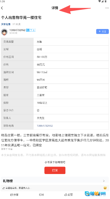 点击房源或帖子查看详情页信息。