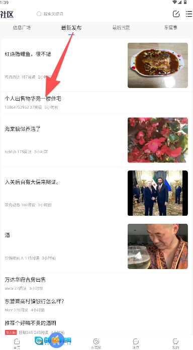 进入社区页查看最新发布等版块的图文帖子列表。