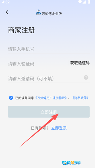 万师傅企业版商家注册,请点击首页登录页面的注册。