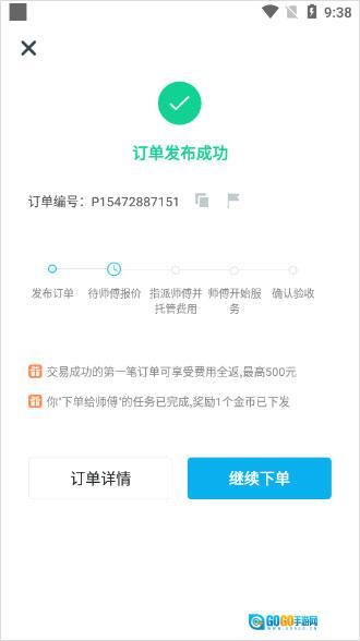 订单发布成功后,请耐心等待师傅与您取得联系,客服也会全程跟进派送进度,您只需留意电话通知即可。
