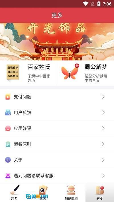 在更多界面,为用户提供百家姓氏、周公解梦、用户反馈、起名原则等功能