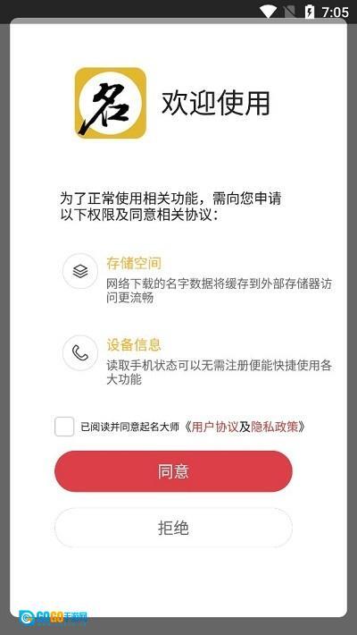首先在本站找到起名大师并进入对应的软件,进入软件后,勾选用户协议和隐私政策,然后点击同意按钮。