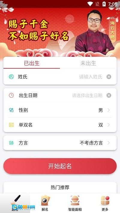 进入软件的起名界面后,系统会为用户提供已出生和未出生两种起名选项。用户只需输入姓氏、日期、性别、单双名等必要信息,随后点击“开始起名”按钮,即可完成起名流程。