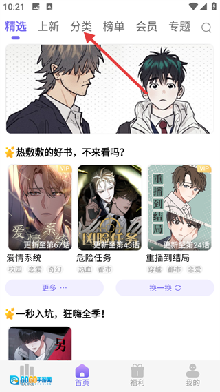 打开耽漫神器后,点击【分类】标签,就能浏览各个不同板块的内容啦。