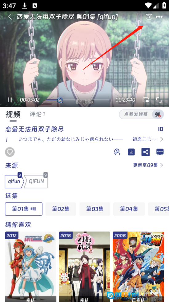 一键点击进入播放详情页,点击右上角"tv"标志。