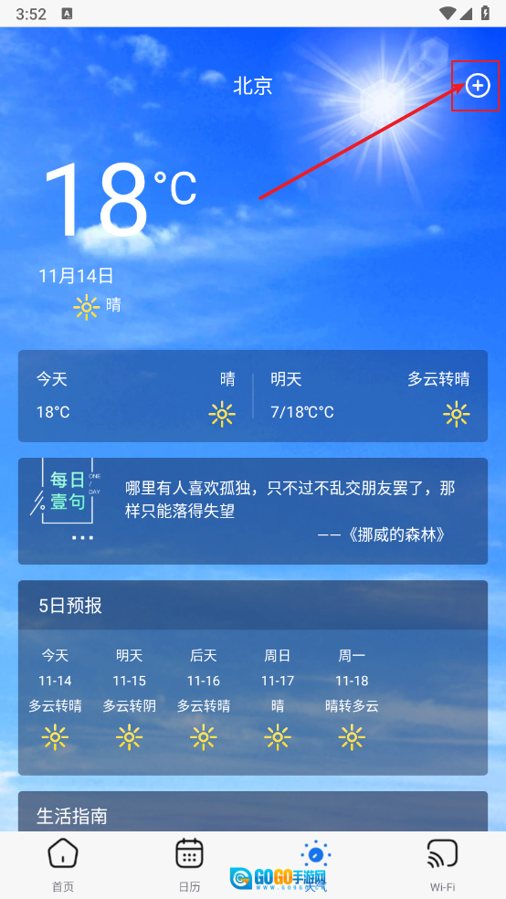 然后在"天气"中,点击右上角添加所需城市的天气。