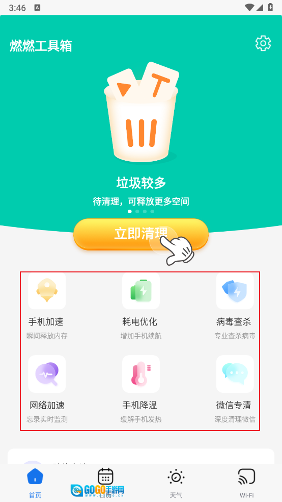 进入首页后,手机加速、手机降温、网络优化等功能一目了然,均可一键直达。