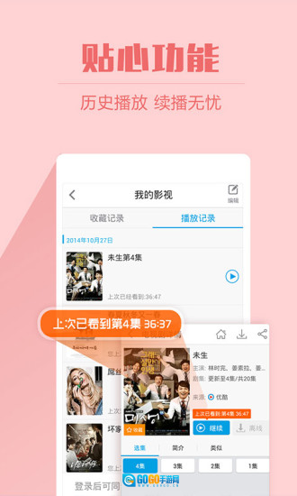 历史记录:具备回放记录功能,可助您快速定位到上次观看的节目。