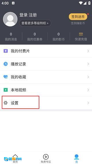 切换至个人中心页面后,在该界面能够查看我的播放历史、收藏的视频等内容,此时需点击列表里的“设置”选项。
