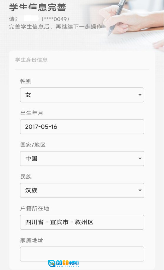 第三步:完善学生个人信息,填写真实的学生身份信息,具体可参考图示内容。(特别提醒:此处的家庭地址需填写户籍地址,即户口本首页上登记的地址)