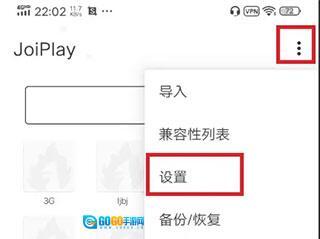 首先打开joiplay模拟器,点击右上角“三个点”图标,在弹出的菜单中选择“设置”(settings)选项。