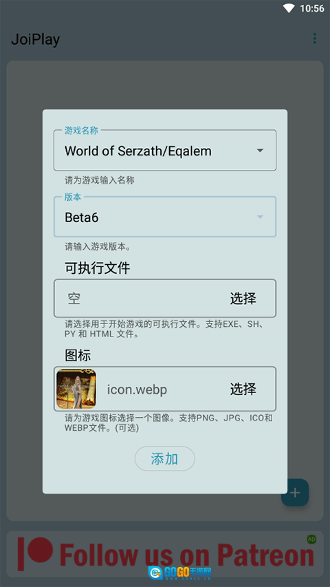 操作文件夹后会弹出一个配置界面,其中“名称”栏可任意输入内容,“可执行文件”项需点击“选择”按钮来指定安卓游戏对应的game.exe文件;图标部分可留空,也能自行挑选喜欢的图片,最后点击“添加”按钮即可完成设置。