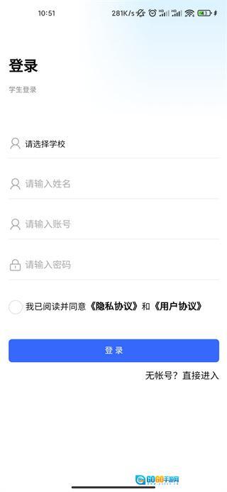 在平台的资助通功能入口进入后,先选定所属院校,接着填写个人姓名、登录账号及密码等必要信息,同时勾选同意相关用户条款;若暂未注册账号,可点击界面右下角标注“无账号?直接进入”的选项继续操作。