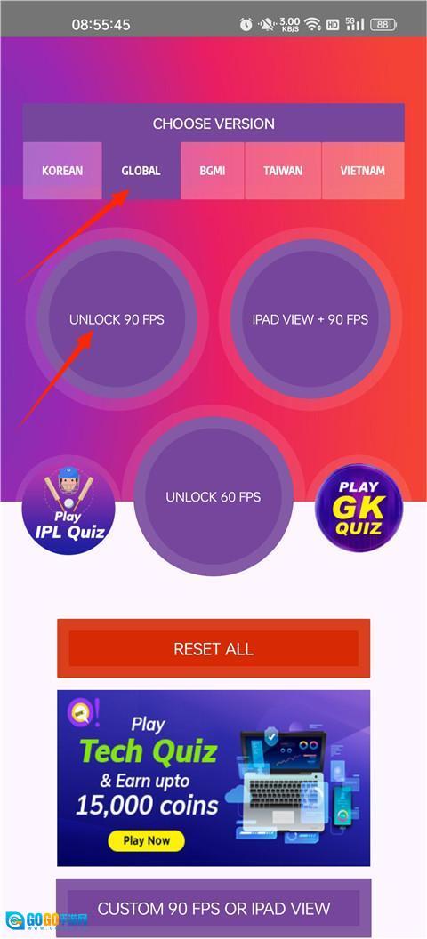 启动应用程序后,先将运行模式切换至全局设定,随后启用高帧率解锁功能以支持90帧运行。