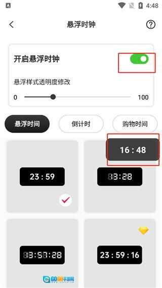 轻点悬浮的时钟图标,再按下启用按钮,就能让悬浮时间显示功能生效,此外还能在秒表与时钟两种显示模式间切换。