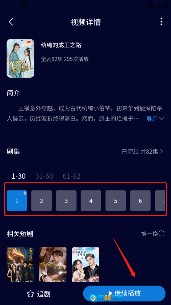 选好后打开,选定要看的集数,点击“继续播放”就能观看了。