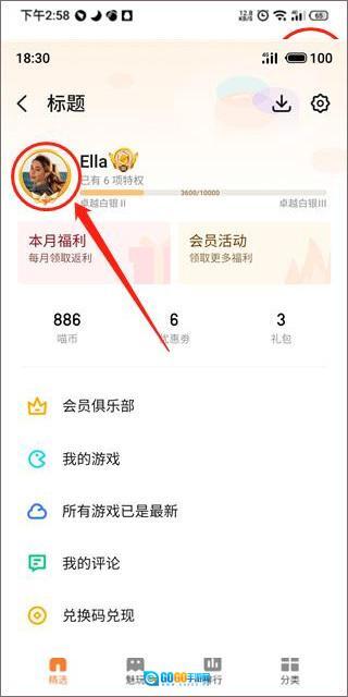 用户打开并登录魅族游戏中心后,点击页面右上角的头像(即下图红色箭头所指向的位置)
