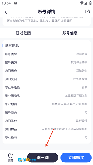 要是对交易流程或者游戏账号信息还有需要深入了解的地方,可以点击【聊一聊】,和交易对方再进一步沟通沟通。