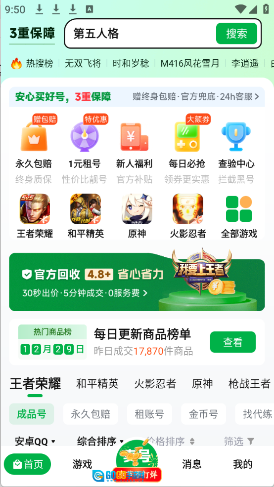 首页上陈列着多种游戏账号类型,涵盖王者荣耀、蛋仔派对、和平精英等热门游戏。