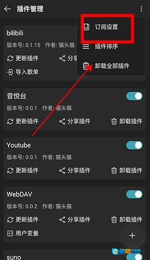 在插件管理界面,找到右上角的三点图标并点击,随后在弹出的选项中选择订阅相关的配置项。