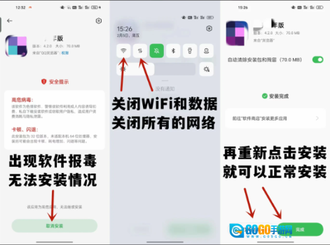 软件安装时若出现报毒提示且无安装按钮,开启飞行模式或断开网络后重新安装即可解决。