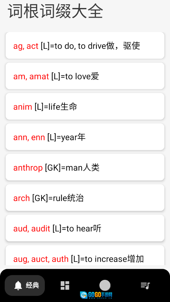 英语词根词缀字典,借助拆解单词词根词缀的方法助力用户轻松记忆单词,支持一键查询功能,对于备战四六级、考研以及专四专八的用户而言十分实用,平台还提供众多免费学习资料。要是你仍在为记不住单词而烦恼,这款字典能帮你轻松攻克记忆难题。