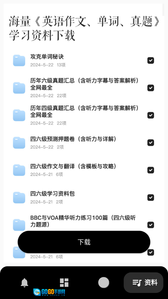 大家可以通过资料页面获取所需的学习资源,其中包括背单词技巧、四六级单词及写作技巧等内容。