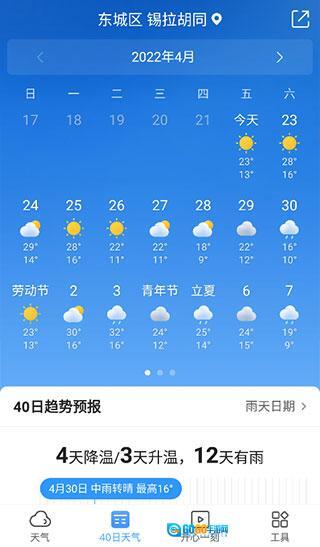 进入40天天气界面,能了解接下来一个多月的天气趋势,系统还会自动汇总气温波动的天数以及降水的天数,各类天气信息清晰直观。