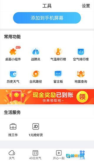在工具页面中,你可以把天气小组件添加到手机屏幕上,这里还提供台风路径查询、地震信息查询等实用功能,此外还有丰富的生活服务等你来体验。