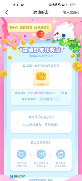 启动应用后,通过邀请好友的功能可获得大量乐币奖励,邀请人数达标还能额外领取畅玩卡与充值券等福利。