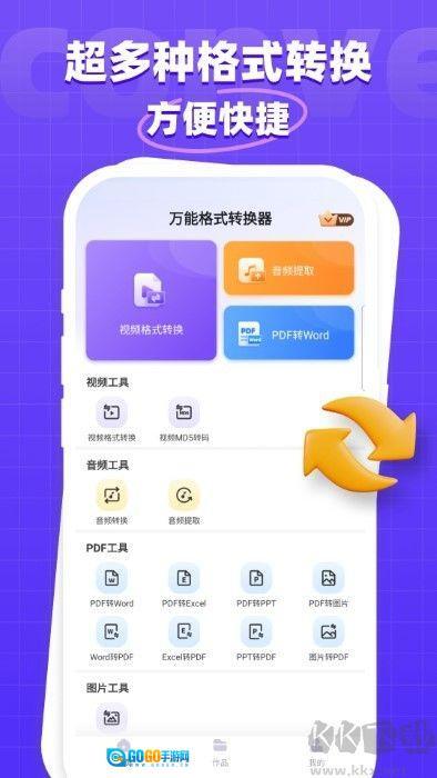 万能格式转换器是一款为用户提供了多种格式转化功能的软件,如视频格式,音频格式,文档格式,图片格式转换等,用户能够利用这款软件轻松的转换各种自己需要的格式,操作起来也是非常方便,感兴趣或者有需要的小伙伴就快来kk网站体验一下吧。