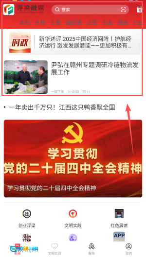首先在手机的应用商店里搜索“浮梁融媒”,安装完成后打开这个应用,不需要注册就能直接进入主界面。