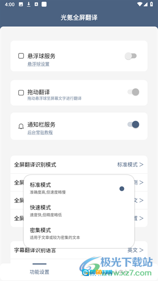 点击全屏翻译识别模式后,可在标准、快速、密集这三种模式中进行选择。