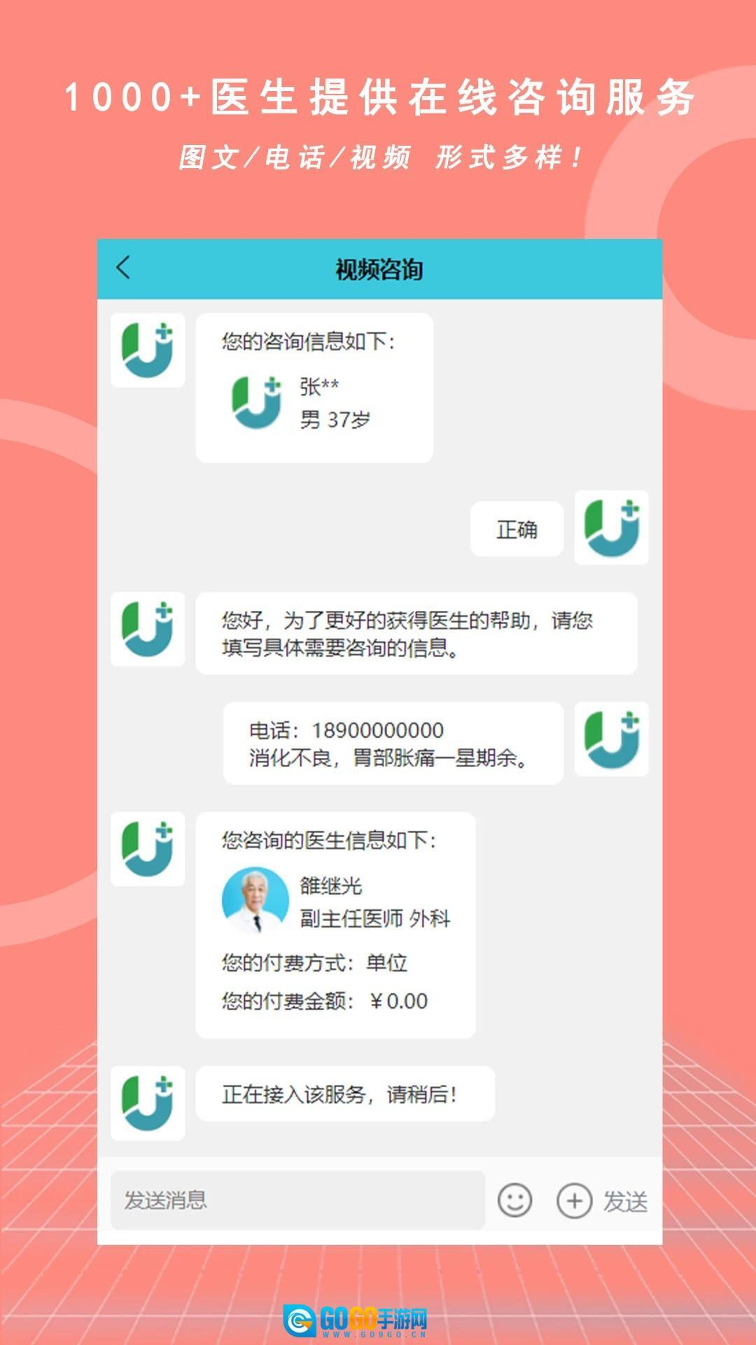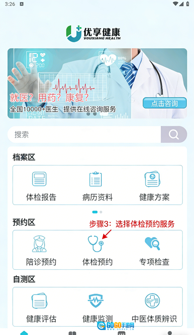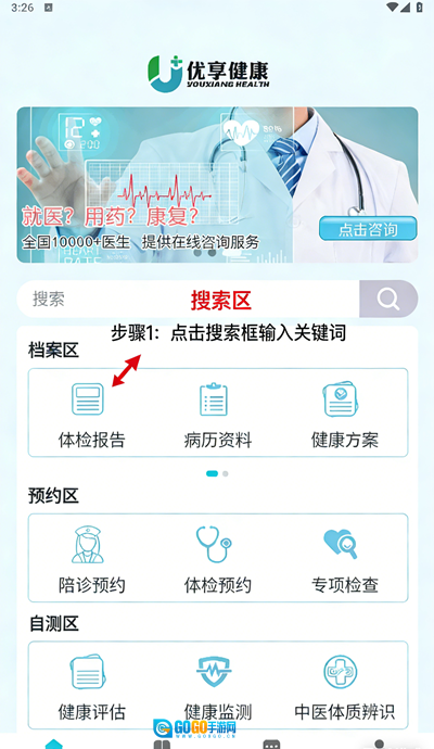 打开优享健康应用后,首页会呈现“就医、配药、康复”的服务入口,同时显示全国有1000多名医生可提供在线咨询的提示,用户点击相应的功能模块就能进入对应的服务页面。