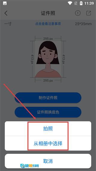 当弹出选项框后,可选择【拍照】或者【从相册中选择】这两个选项,通过获取照片来制作出符合对应尺寸要求的证件照。