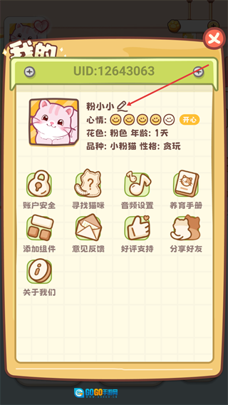 点击左上角【粉小小】的头像区域,即可打开猫咪信息界面。