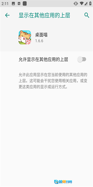 点击后会跳转到权限设置界面,在该界面中开启“允许显示在其他应用的上层”这一权限即可。