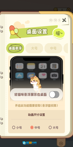 你可以在桌面设置功能里找到桌面悬浮选项,然后根据需求选择小号、中号或大号,最后点击开启按钮即可。