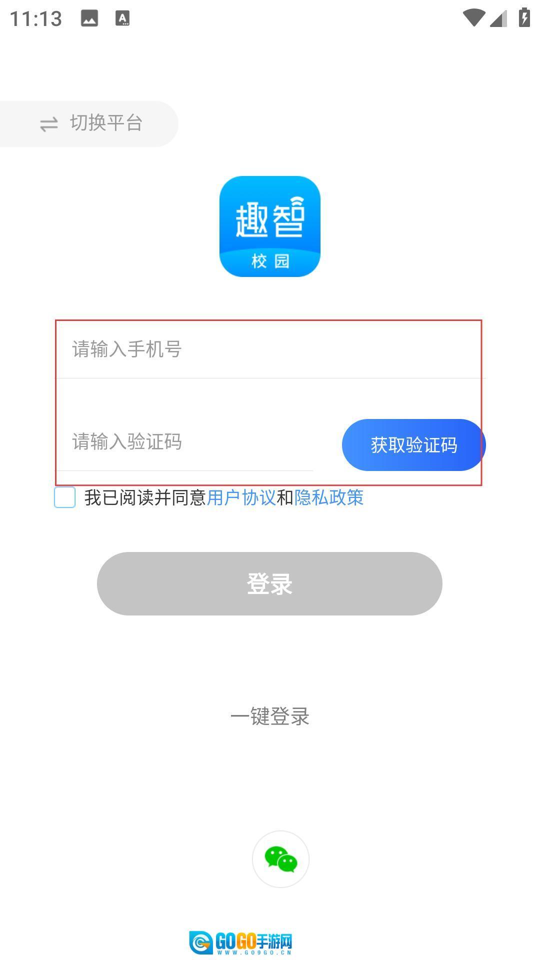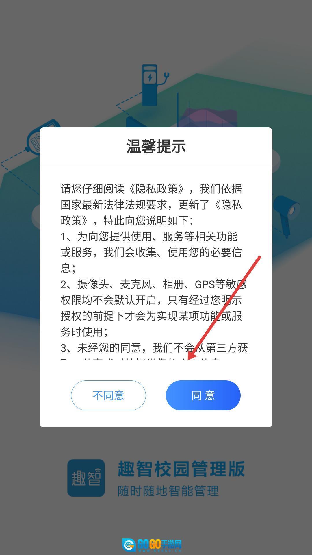打开趣智校园应用,仔细阅读页面提示后点击“同意”按钮,即可进入登录界面。接着输入手机号并获取验证码完成填写,就能开启校园管理相关的体验服务了。