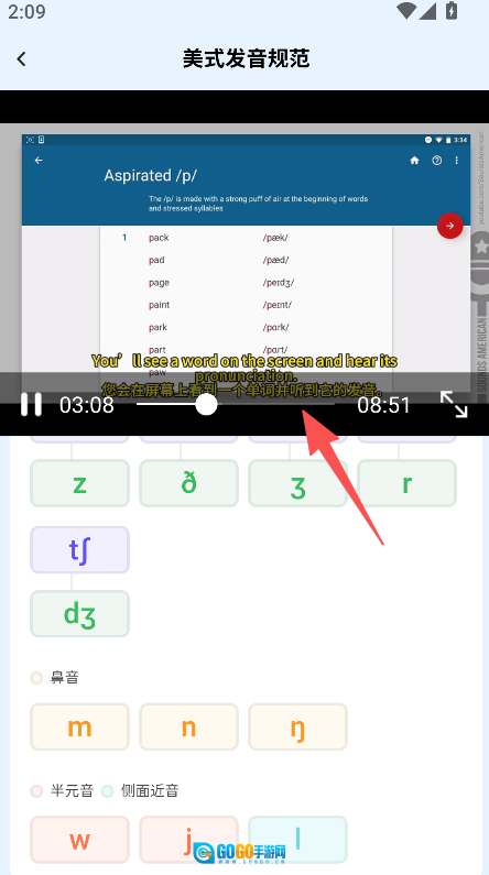 我们提供视频学习功能,当你点击对应的音标内容时,就能查看与之配套的视频,还可以自主控制播放进度,从而完成音标的学习任务。