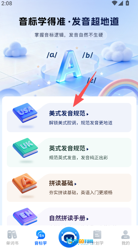 具备发音规范选择功能,进入音标学习页面后,点击美式发音规范选项,即可查看该发音规范对应的详细学习内容。