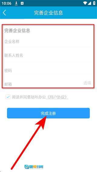 在完善企业信息页面填写相关信息,勾选对应协议后,点击完成注册按钮,即可完成注册操作。