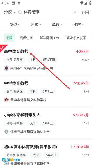 搜索结果页面会呈现出对应的岗位信息,比如【高中体育教师】这类岗位,在该页面上能够查看职位的薪资待遇、工作地区等相关内容,点击想要了解的目标职位就可以进入到职位详情页面。