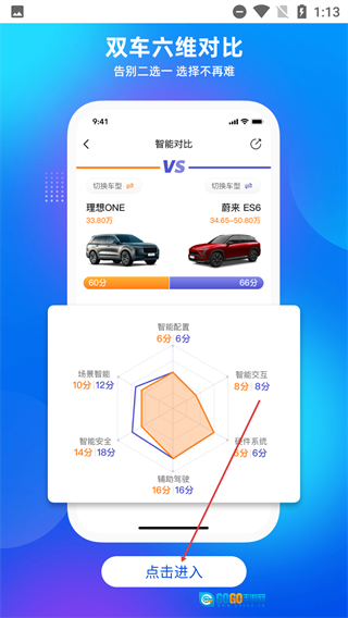 在双车对比页面点击【点击进入】按钮,就能进入应用的主功能流程,进而体验车型对比等相关服务。