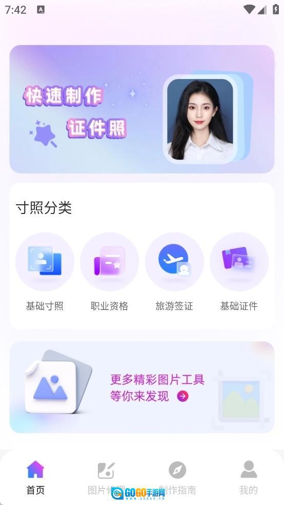 1、首页设置了基础寸照、职业资格、旅游签证、基础证件等寸照分类板块。