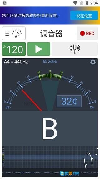 软件启动后默认显示节拍器界面,点击顶部的“调音器”字样即可切换至调音器功能。